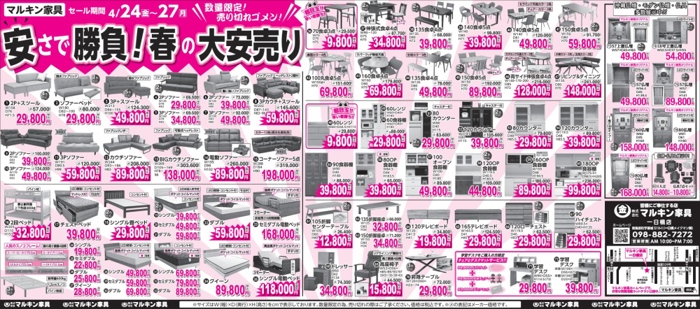 春の大安売りSALE(4/24~4/27) チラシ情報 セール情報 \安さで勝負!/春の大安売り ※画像をクリックすると拡大されます。 ⇩期間⇩4月24日(金)~4月27日(月) 数量限定!早い者勝ち! ソファー・食卓セット・食器棚TVボード・ベッド・洋服タンス etc...特別大特価商品、掲載以外にも多数展示しております♪ マルキン家具へ急げ~!!お買い逃がしがないよう、ご来店お待ちしております。 2026年04月24日 一覧へ戻る